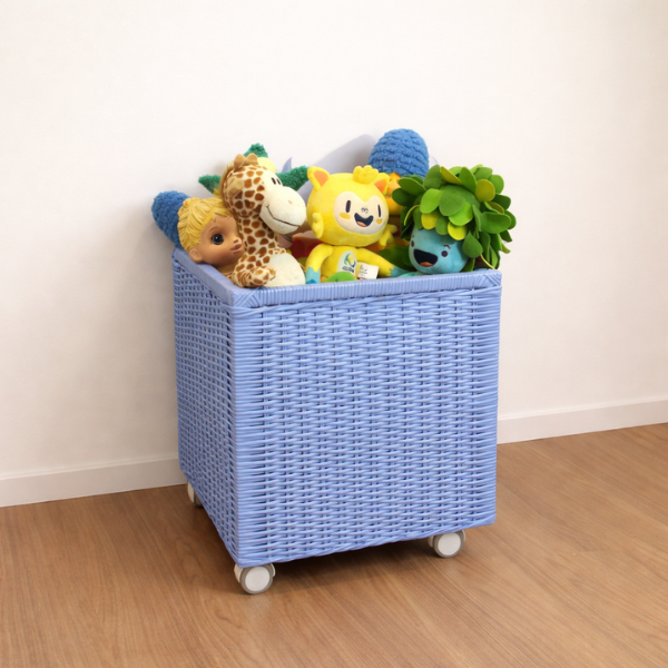 Baú organizador infantil em fibra sintética com rodízios (vime sintético) - Cor azul claro
