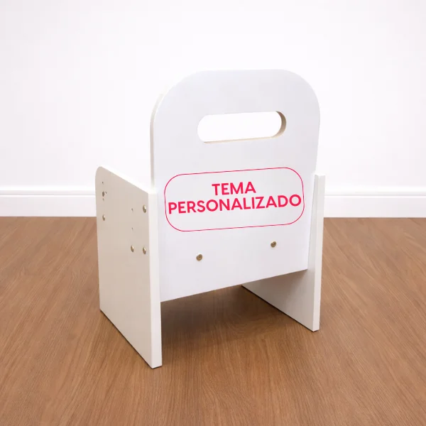 O grande diferencial está na personalização: a mãe pode escolher o tema adesivado no encosto da cadeira, tornando o ambiente ainda mais especial, lúdico e exclusivo. Um móvel que une funcionalidade, cuidado com o desenvolvimento e um toque único de personalidade para o quarto ou cantinho de estudos.