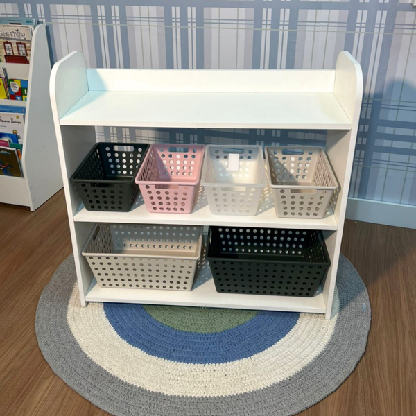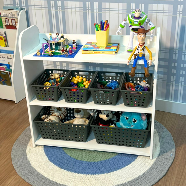 Organização com charme e propósito! Este organizador de brinquedos com três prateleiras foi pensado especialmente para os pequenos exploradores.