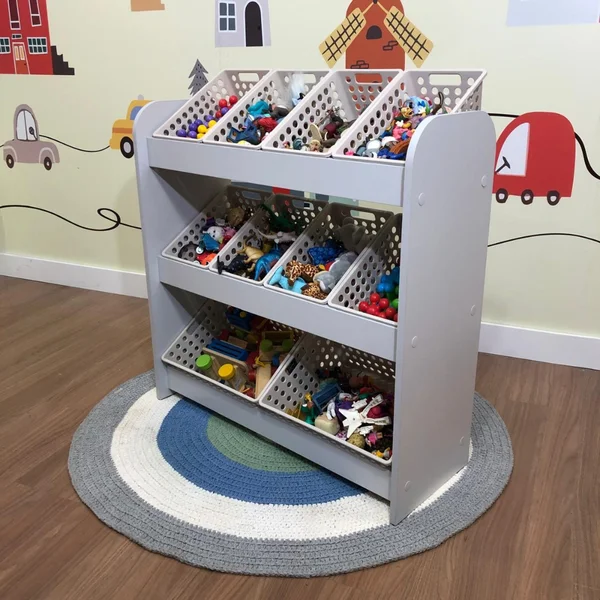 Este organizador é um dos nossos campeões de vendas e não é por acaso! Com cestos inclinados e de fácil acesso, ele segue os princípios montessorianos, permitindo que os brinquedos fiquem visíveis e ao alcance das crianças, incentivando a escolha livre e consciente.