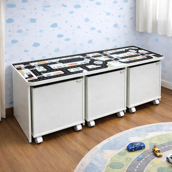 O rack para três baús infantil da Organizemobili é a união perfeita entre organização, diversão e design inteligente. Desenvolvido com materiais resistentes e acabamento premium, ele oferece total segurança para o uso infantil no dia a dia. Seu grande diferencial está no tampo adesivado em formato de cidade, que transforma o móvel em um espaço lúdico para brincar com carrinhos e brinquedos, estimulando a criatividade por horas. O conjunto acompanha três baús com rodízios, facilitando o acesso e a organização dos brinquedos, além de mais três baús adicionais que ampliam ainda mais a funcionalidade do produto. O fundo mantém os baús sempre alinhados e no lugar certo, garantindo resistencia, visual organizado e muito charme para o quarto ou brinquedoteca. Um móvel versátil, bonito e pensado para acompanhar a rotina das crianças e dos pais.